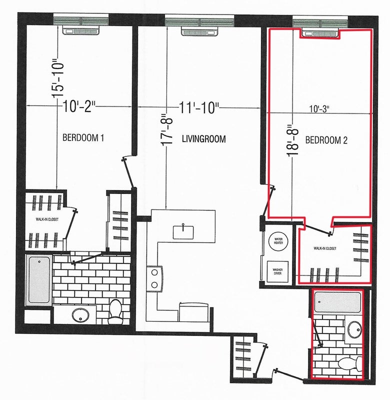 The bedroom is approximately 10' x 18' with a large window that gets good natural light and a view of downtown Manhattan. The room can comfortably fit a queen-size bed. It comes with a walk-in closet and its own private bathroom (not shared) with a full tub/shower combo. The room will be unfurnished.