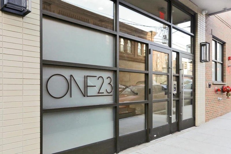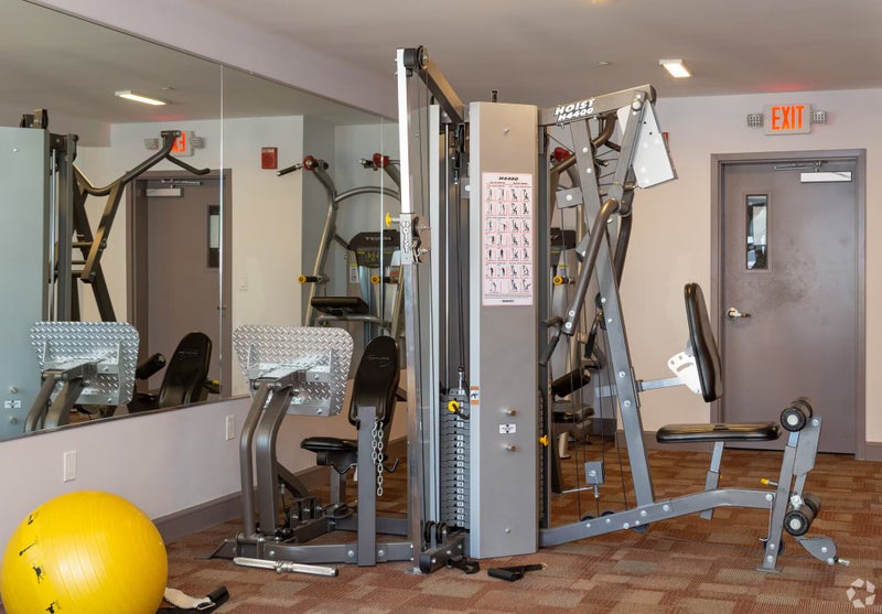 The building features keyless entry with facial recognition, a fitness center with free weights and cardio machines, a second-floor sundeck with seating and grills, secure mailroom, parking garage (spaces are $150/mo), elevator access, and virtual doorman system. The neighborhood is walkable with shops and restaurants nearby, including a Lidl grocery store 10 min walk away.