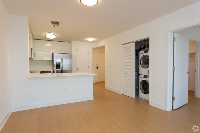 The apartment is on the 5th floor of a professionally managed building in Union City (Hudson County). The unit has hardwood-style flooring throughout, a modern open kitchen with stainless steel appliances, quartz countertops, and a dishwasher. There's an in-unit washer and dryer, a spacious living room, and a large pantry/storage closet. Each bedroom has its own PTAC heating and cooling unit.