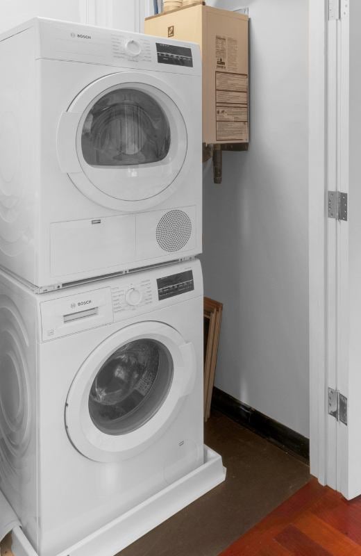 Bright, fully tiled bathroom. Your own heat pump heatingAC system, hot water heater and washer & dryer. Stunning Brazilian Cherry wood floors throughout. Big closets with organizers. Building is very well insulated. All appliances are EnergyStar (high efficiency) for low utility bills. On site parking for cars + EV charging.