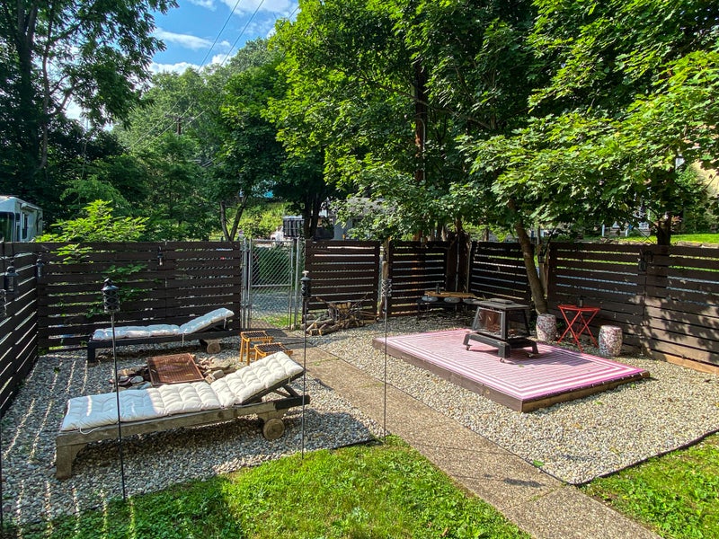 The house has a lot of great attributes, like a home gym, jacuzzi bathtub, original hardwood floors throughout, ceiling fans in all bedrooms, front end loading high-efficiency washer and dryer, updated eat-in kitchen with dishwasher, off-street parking, a covered and decorated front porch, a backyard fire pit and lounge area, and a fenced in backyard that's just waiting for the right garden-loving person to plant some vegetables (we have a compost ready to go!).