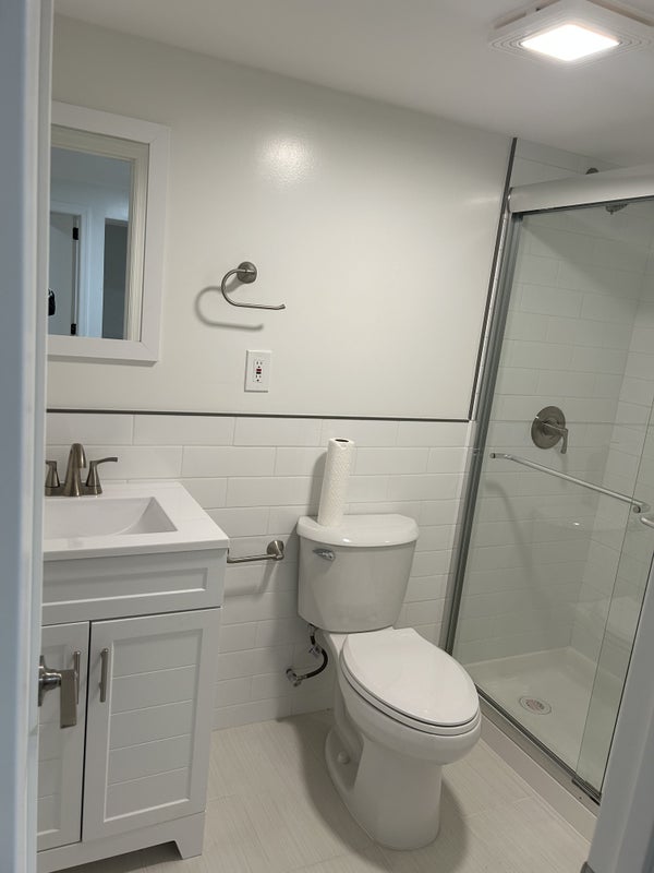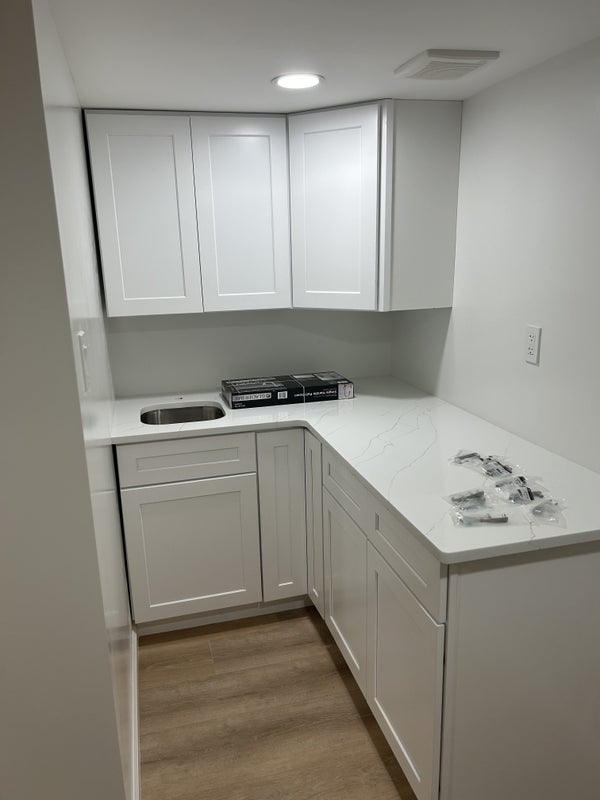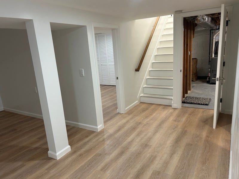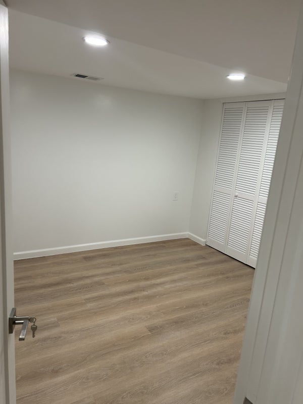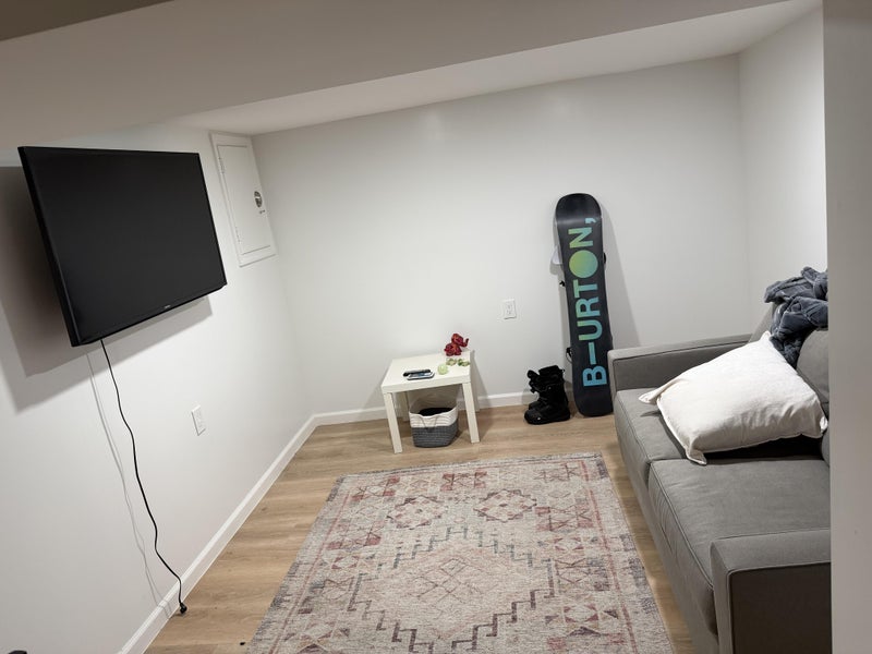 Newly finished basement of single family home. Unfurnished private bedroom with private bathroom. Private side entrance. Living area with large screen TV, kitchenette with fridge, mini electric stove, microwave, cabinets and sink.