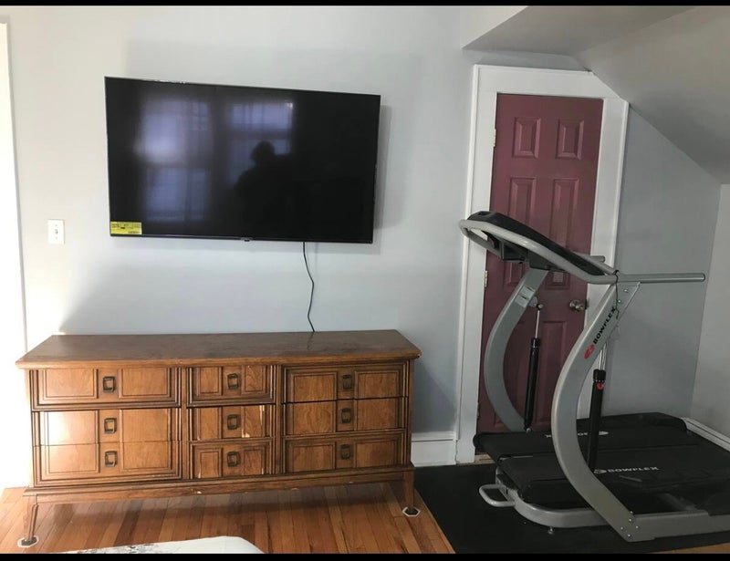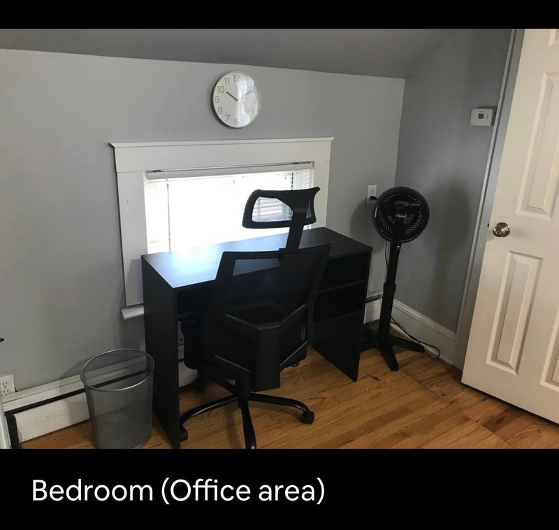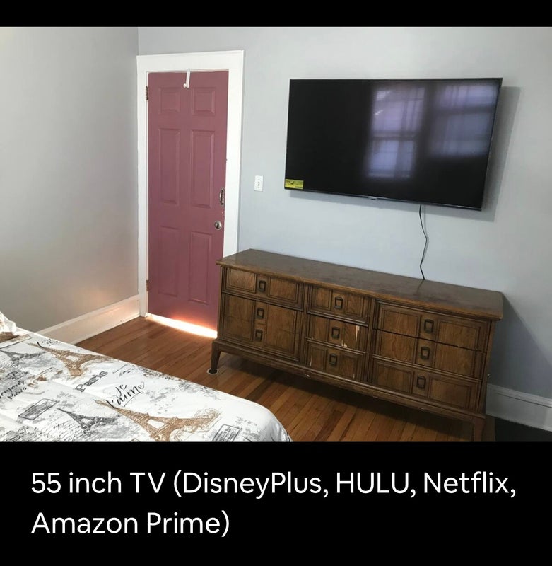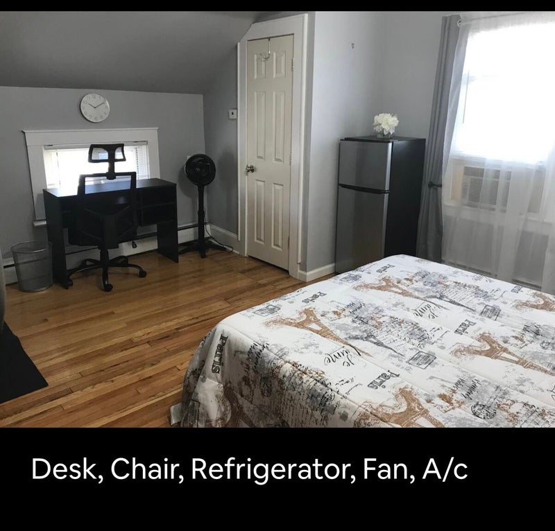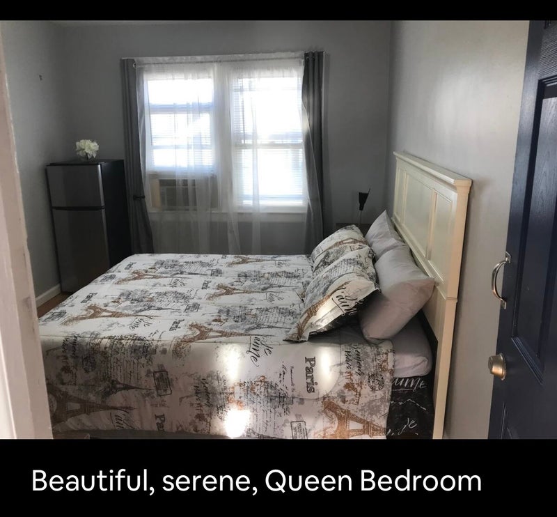 Large sun filled furnished bedroom with queen sized bed, desk, chair, 50 inch smart tv, private en-suite bathroom and available parking space in driveway. Owner occupied house share looking for calm, professionals. All utilities included. Bus 114 to NYC 42 street