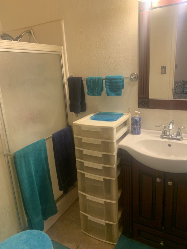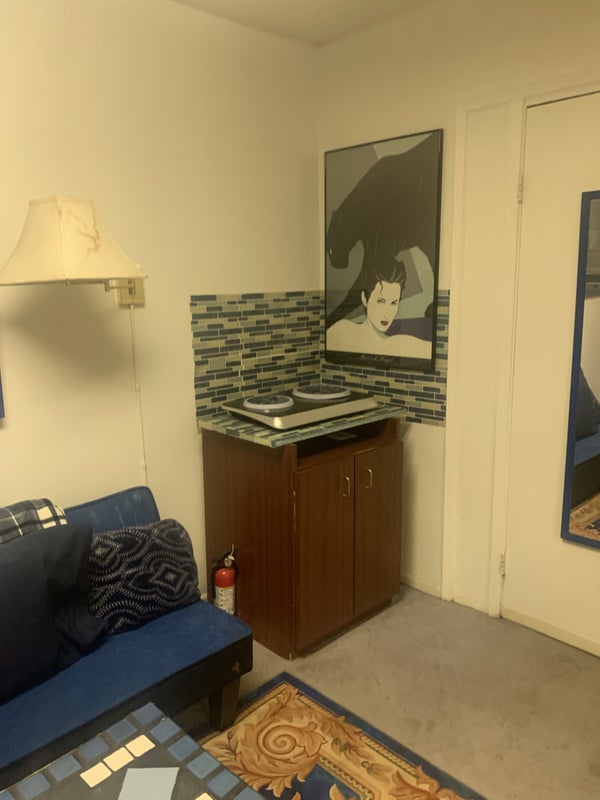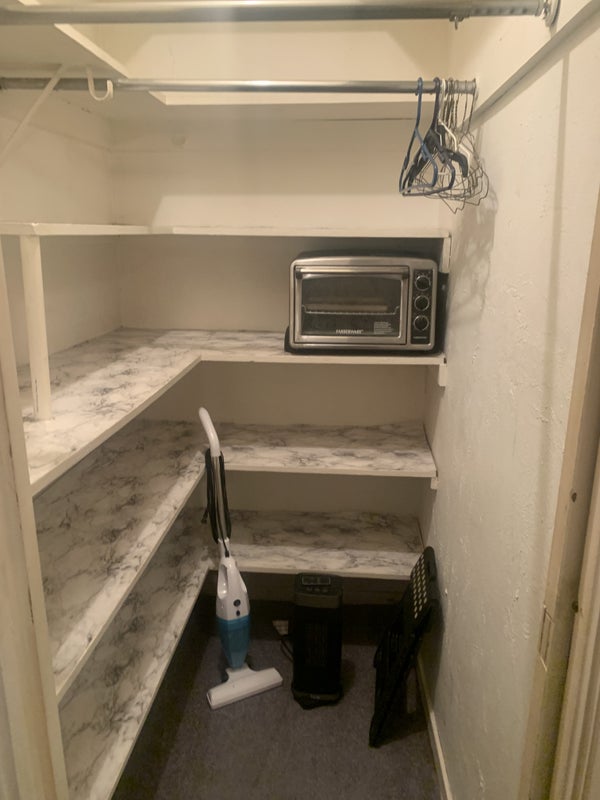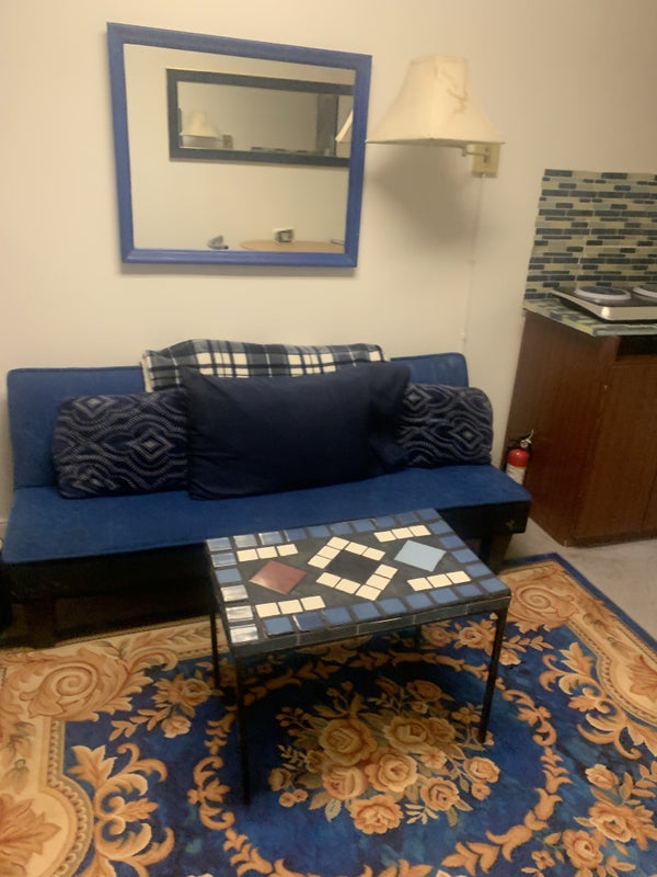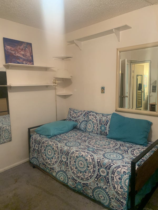 2 rooms with private bath street parking quiet neighborhood Huntridge area near art district utilities included Trundle bed 2 dressers computer desk walk in closet lots of shelves sitting area couch coffee table dinette for 2 cooking station with all supplies NO KITCHEN SINK 2 burner stove top and toaster oven and coffee maker refrigerator and tv with fire stick . Ceiling fan sm dog ok with deposit 150 NO CATS I AM ALLERGIC TOTAL MOVE IN 1100 without a pet see pictures