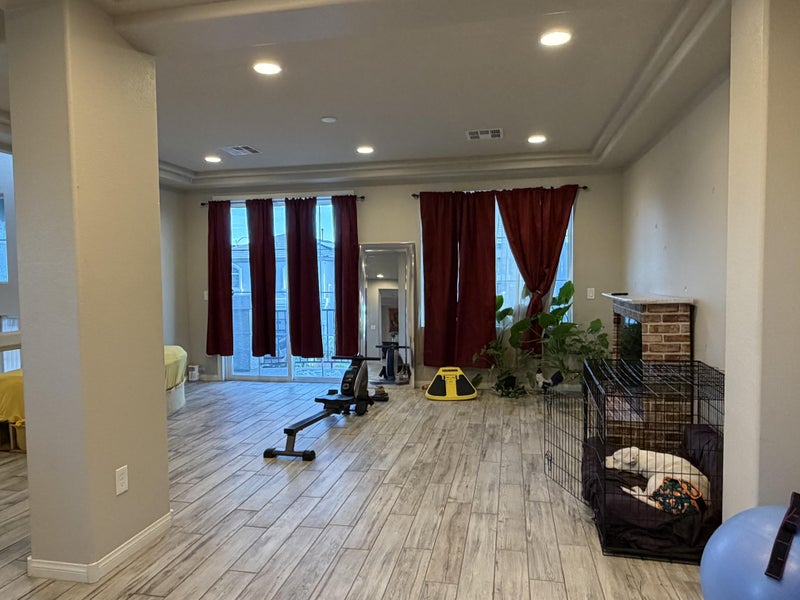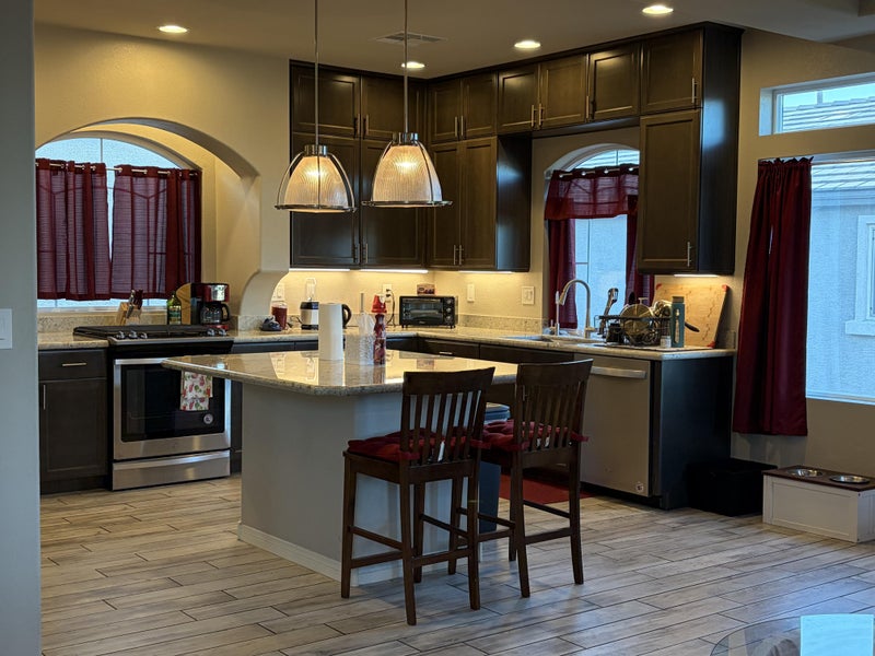 **Home and Living** The house offers a beautiful open floor plan in the main areas. A lovely kitchen if you enjoy cooking, plus a toaster oven and microwave if you don’t. The living room is currently under construction—it used to be a gym/dog training area—but furniture is on the way. There is a downstairs laundry room with a washer and dryer.