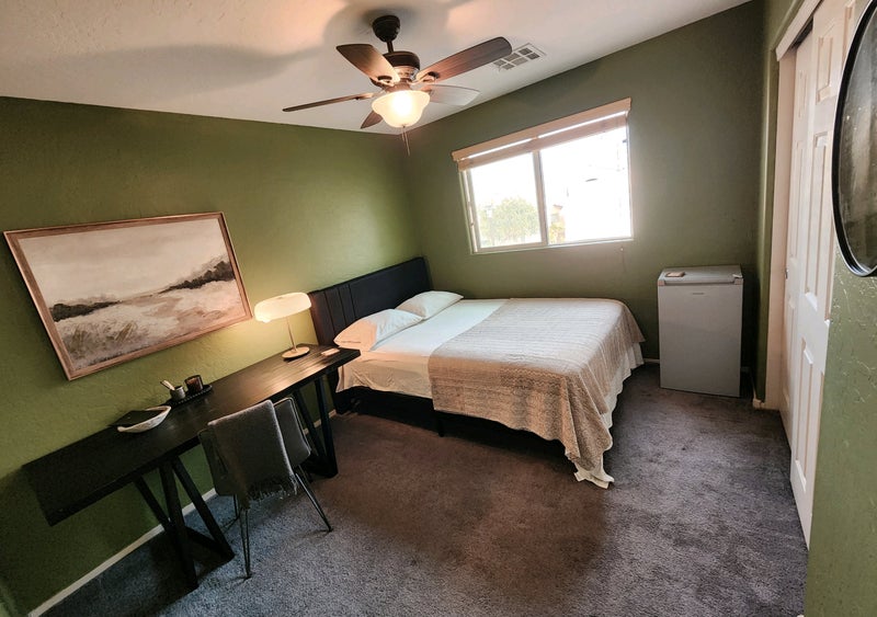 Cool space for rent. Furnished with upholstered queen platform bed, desk, and personal mini fridge. Includes private bath, shared sitting room (just outside bedroom), and single parking in driveway. Sheets and towels provided if needed.