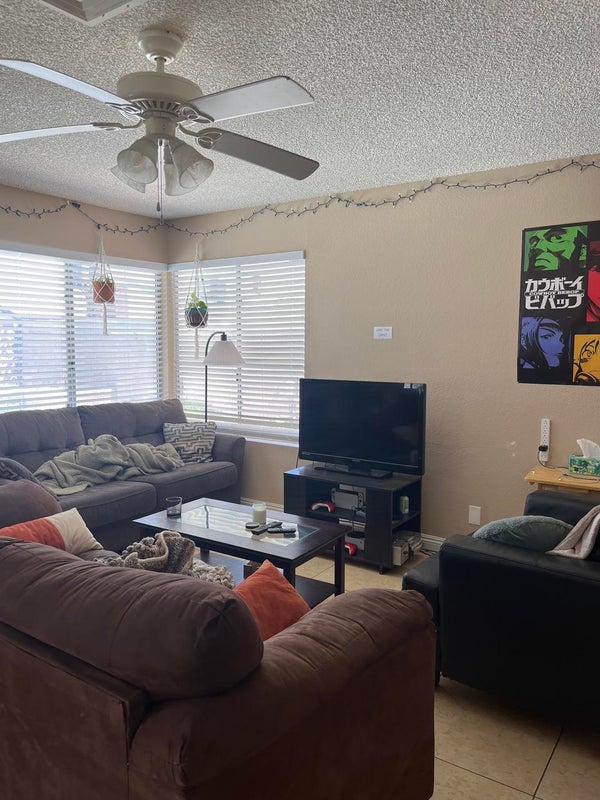 - 1 room has a full size bed, fee is included with rent price - month to month lease - both rooms have a separate bathroom - amenities: pool, back yard, in unit laundry, AC - utilities are about $3-400 per month, split between number of occupants