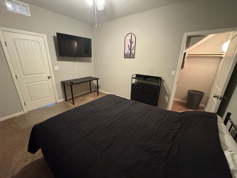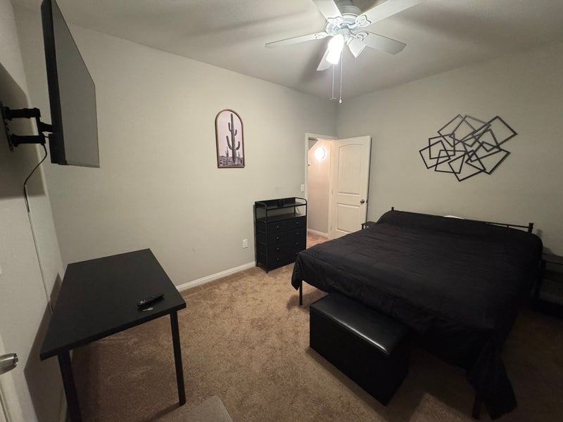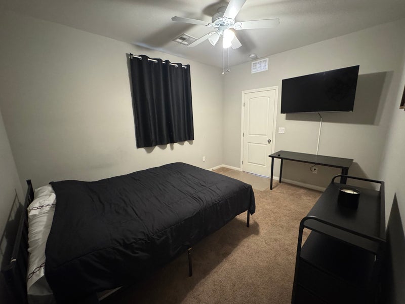Room details: The room is upstairs and measures about xft. The room is furnished with a table chair, queensize bed, inch smart tv, dresser! The bathroom is shared. Month to month lease