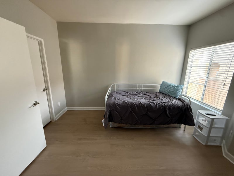 Room is decent size. Close to 12 by 11 with walk in closet. You would have your own bathroom, but it shares to the living space. I have a bed in there but I can take it out if wanted to bring your own furniture! I am going to give birth in June, so you would have the place to yourself for a little over a month. So short stays more than welcomed, but if want to stay, more then welcomed as well!