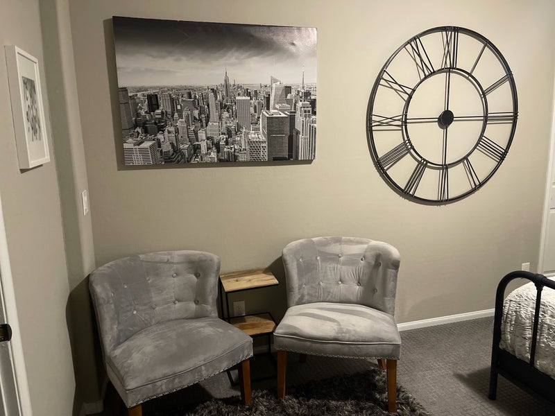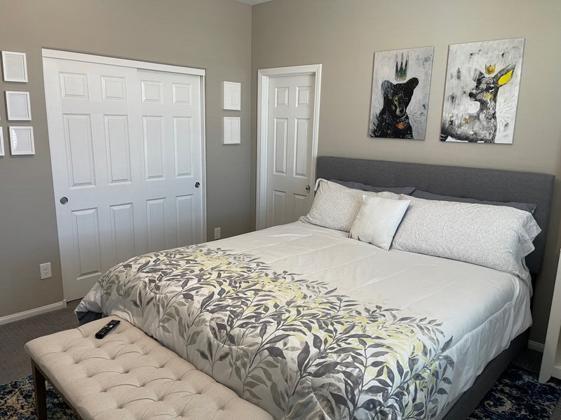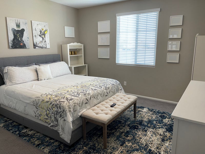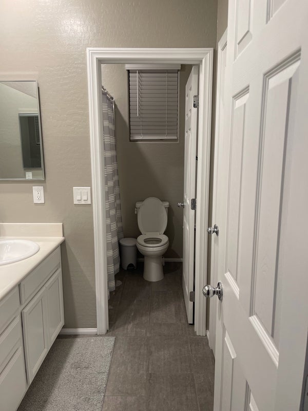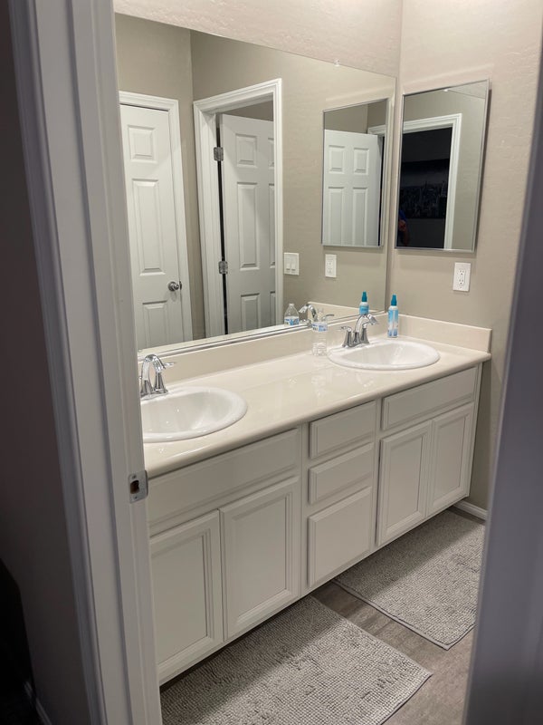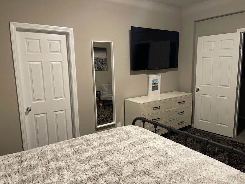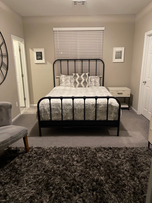 The large room fits two double beds or one big Cali king. Small one can fit one double or queen. The large room has a slide closet. The small one has a walk in closet. They both share a connecting jack and Jill bathroom. Renting the two connecting rooms together. So you have two bedrooms condo style. It’s in a house with just the landlord also upstairs in the master. Comes with a parking spot. Shared backyard. Shared pantry. Shared kitchen. Shared living room. Shard laundry. Message me if you have any questions.