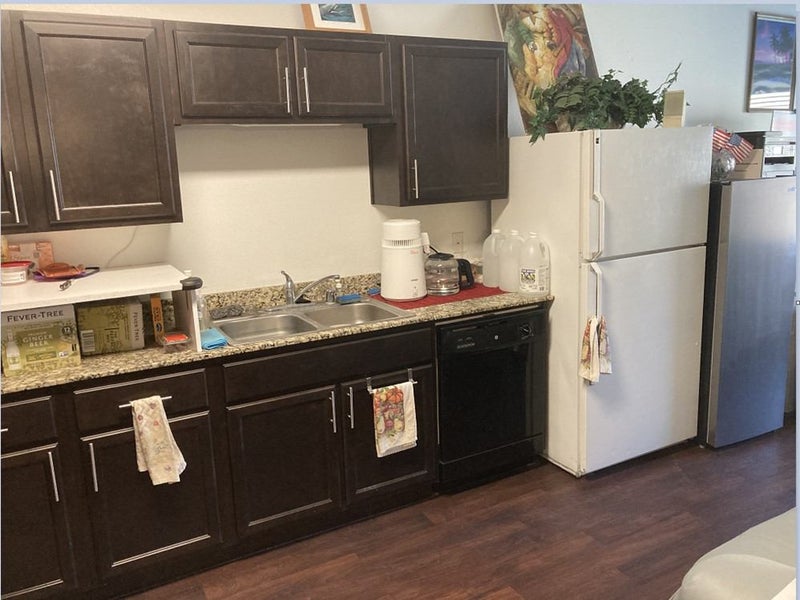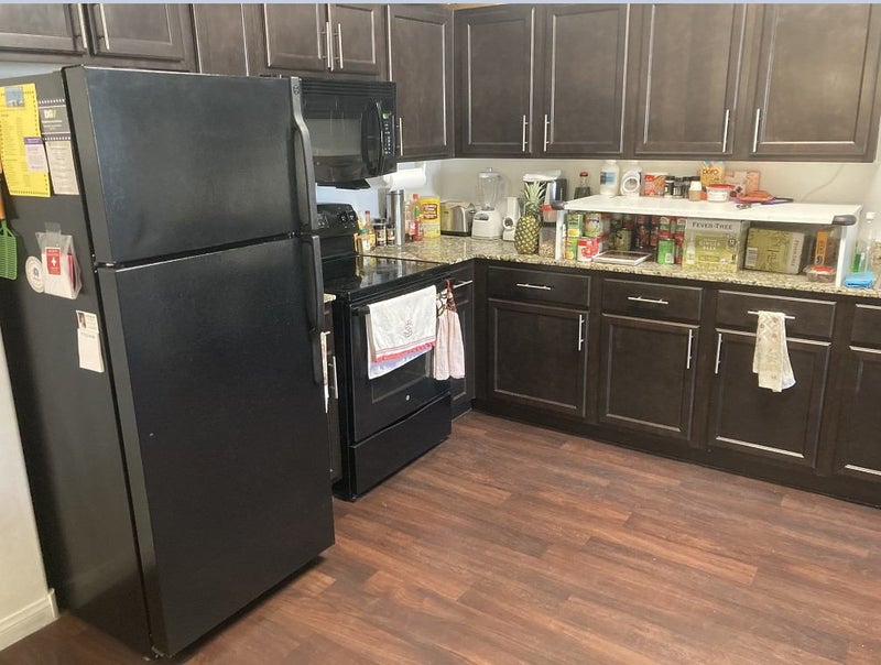 The kitchen has two regular size refrigerators, mine is the white one 20.6 Cu. Ft. and the roommate’s is the black one 18.1 Cu. Ft., so we both have our own refrigerator. The kitchen has many cabinets and we both have our own pantry space. The roommate can use my cooking and kitchen accessories.