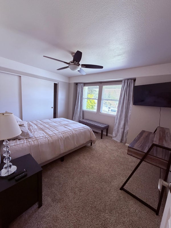 About the Space Welcome to a warm, well-kept 4-bedroom, 2.5-bath home nestled at the end of a quiet cul-de-sac in a wonderful Reno neighborhood. The private room is fully furnished with a desk, TV, and blackout curtains — move-in ready for a student or working professional. You’ll have your own dedicated bathroom (not shared with other renters) and a laundry room conveniently located right next door to your room. The home sits on a generous lot with a large backyard, perfect for unwinding after a long day. You’re within walking distance of the Truckee River and surrounded by great outdoor walking routes. For commuters, the location is hard to beat — just 10–15 minutes from UNR, Saint Mary’s, and Renown, and about 20 minutes to Boca. Your Housemates Your roommates will be me — a professional woman in my 50s — along with one friendly Golden Retriever and two cats. The home is calm, clean, and pet-friendly. Who I’m Looking For This is an ideal short-term arrangement for a student, traveling professional, or someone on a temporary assignment in the area. I’m looking for someone respectful, tidy, and considerate of shared spaces. If you appreciate a peaceful home in a great location, you’ll fit right in here.