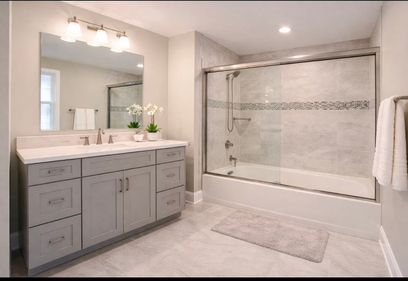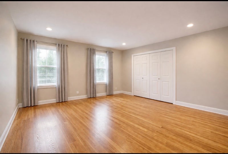 Spacious room with large windows and built-in closet. Full bathroom with sliding glass door bathtub and large vanity.