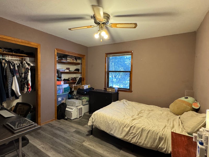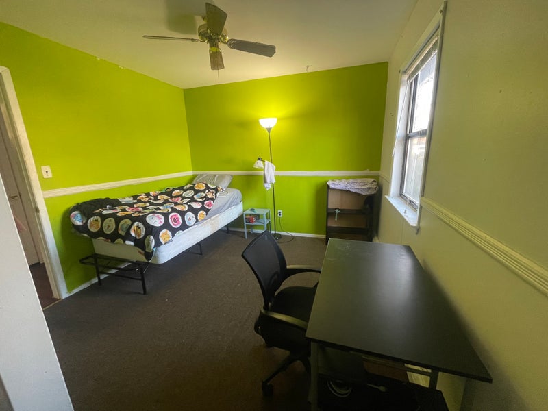 Room: • Approximately 100 sq ft, Upstairs room (green) • Approximately 120 sq ft, Downstairs room (hardwood floors) • Furnished with bed frame and mattress, desk, office chair, bookshelf, lamp • Window AC unit and ceiling fan • Upstairs bathroom is shared with 3 roommates • Downstairs bathroom is shared with 2 roommates