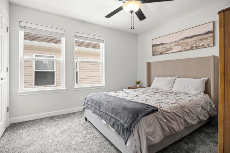 Exceptional Comfort Upstairs, unwind in a serene suite with a queensize bed and an elegantly designed shared bathroom space.