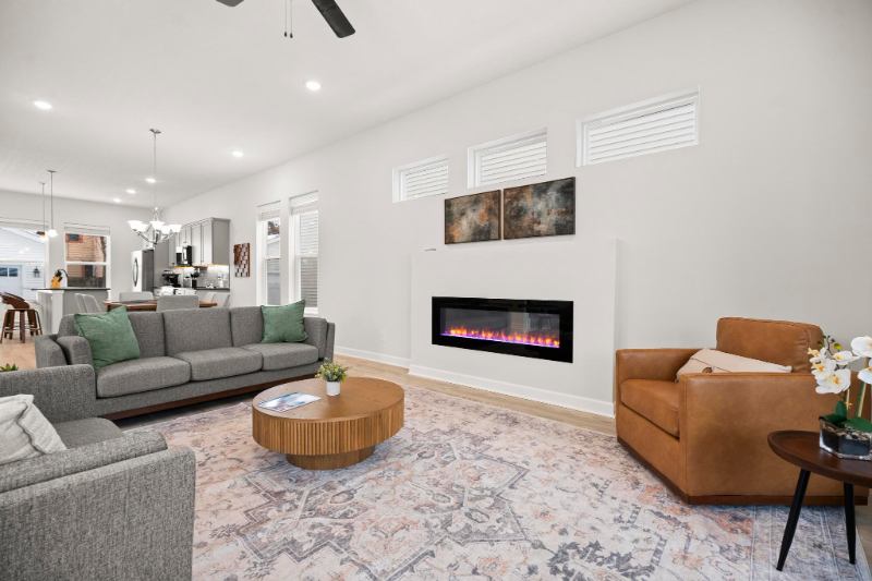 Contemporary, Light‑Filled Living Step through the spacious covered front porch into a bright and airy main level featuring ‑foot ceilings and walls of windows that flood the home with natural light including a modern fireplace feature. The open‑concept kitchen is a showcase of design and function with a waterfall quartz island, premium cabinetry, and a sleek glass‑tile backsplash — ideal for both entertaining and everyday living.