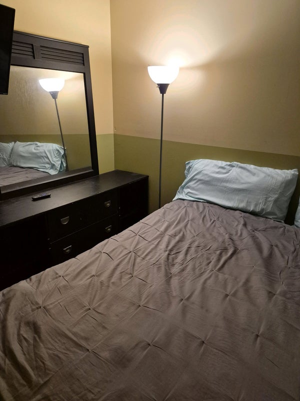 Fully furnished room with TV and internet. Washer dryer use allowed no extra charge on street parking or driveway.