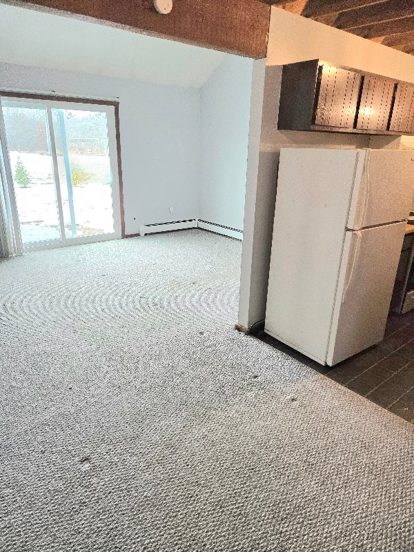 ** This loft has vaulted ceilings and wood beams. All side by side living. It's like living in a condo without the condo fee! The first floor has a half bath, L shaped living room, dining room, and open floor plan to a sliding glass door and concrete patio. Wall to wall closet in the dining room. Galley kitchen with appliances. The upstairs is the loft bedroom, walkin closet, and full bath. Additional storage on the second floor.