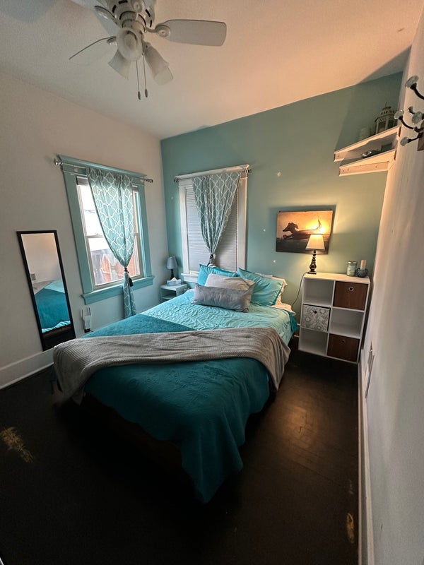 Fully Furnished Bedroom + Private Bathroom | All Utilities Included Spacious fully furnished guest bedroom with a private detached bathroom in a comfortable, well-maintained home. Bedroom Includes: Queen bed with under-bed storage Closet, coat tree, and wall hooks Desk with papasan chair Nightstand and shelving unit Wall-mounted TV with streaming access Two windows with blackout blinds and curtains Private Bathroom: Full bath with dual shower heads Toilet with bidet Full-size vanity with storage Shared Home Amenities: High-speed Wi-Fi Laundry access Living room and basement TVs with streaming Basement workout equipment Reasonable storage space Outdoor Space: Fenced backyard with patio and covered pergola Outdoor TV, dartboard, and hot tub Covered front porch and protected package delivery Kitchen Access: Fully equipped kitchen with stove/oven, microwave, coffee maker, air fryer, dishwasher, cookware, filtered water, and ice maker. You’ll also have your own full-size refrigerator and pantry in the basement. Rent Includes: All utilities, Wi-Fi, streaming services, biweekly professional cleaning of shared spaces and your bathroom. Parking: Street parking typically available directly in front of the home. See photos for additional details.