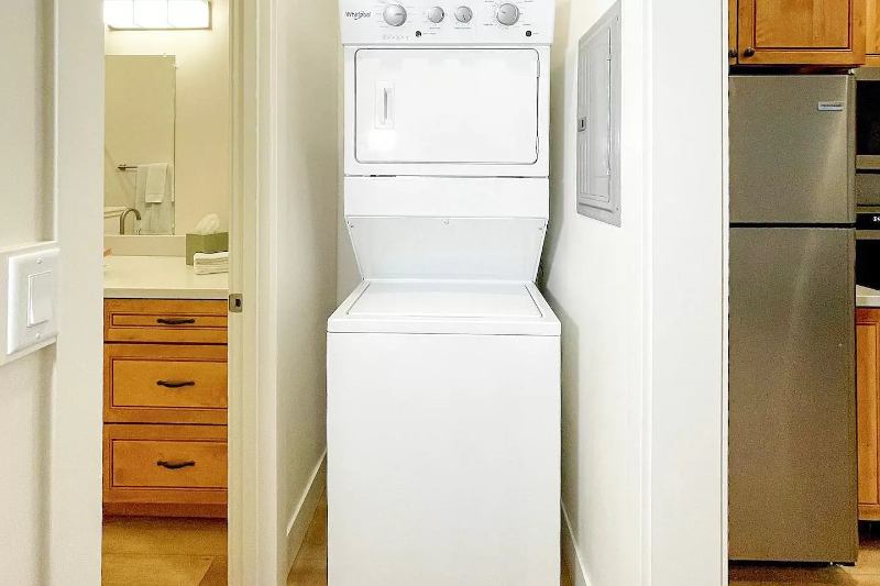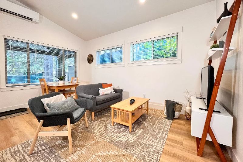 Highlights: Walkin closet + lofted storage in bedroom Tubshower combo with spacious vanity Ductless heating & AC Inunit stacked washerdryer Private covered patio with forest views Locking gear shed Free street parking