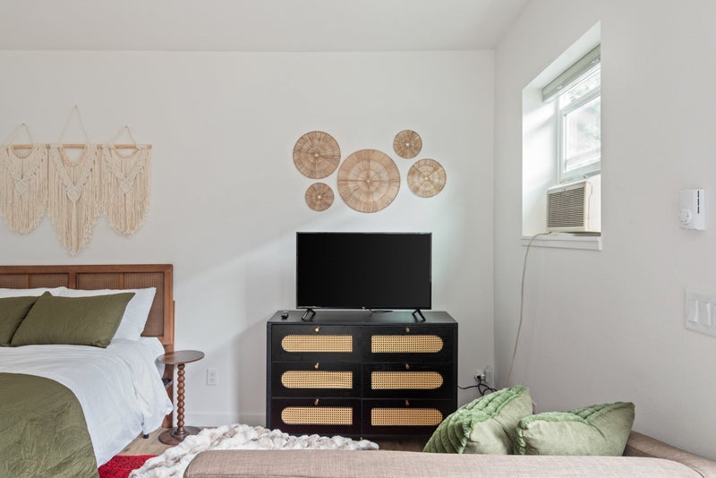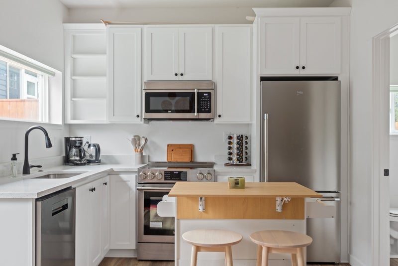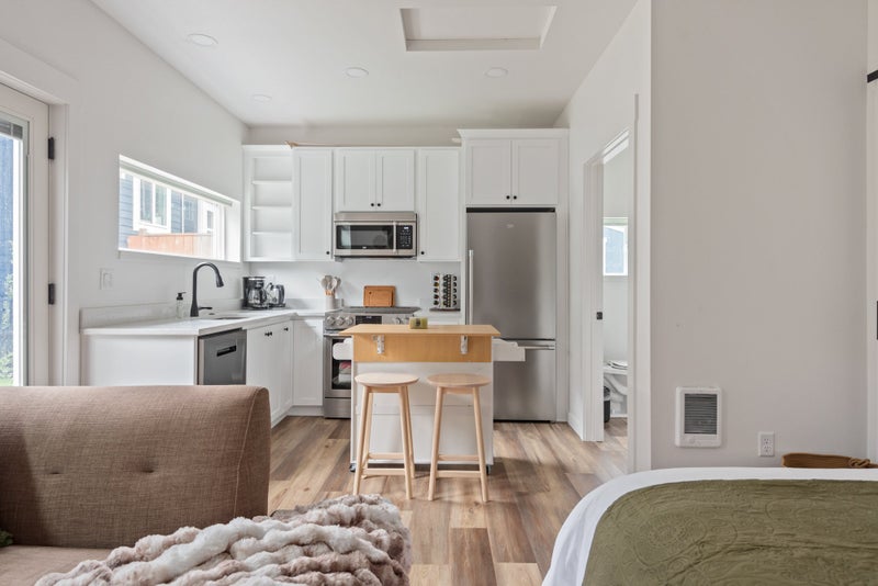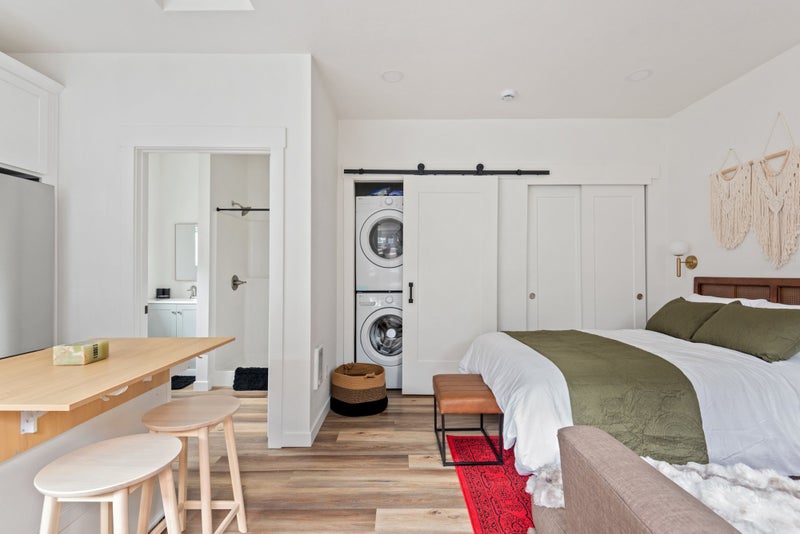 Detached studio ADU behind Duplex. Street parking, full kitchen, in unit laundry, fenced yard. Yard is shared with one other unit. Studio as pictured call for Availability In unit laundry Full kitchen and bath Detached unit, shares no walls Back yard is shared with one other tenant Yard is fully fenced Pets allowed Maximum animals All utilities included in rent Private and quiet