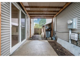 Downstairs there is a shared living room, kitchen, half bath, garage, and outdoor patio. There is a shared washer/dryer laundry room upstairs.