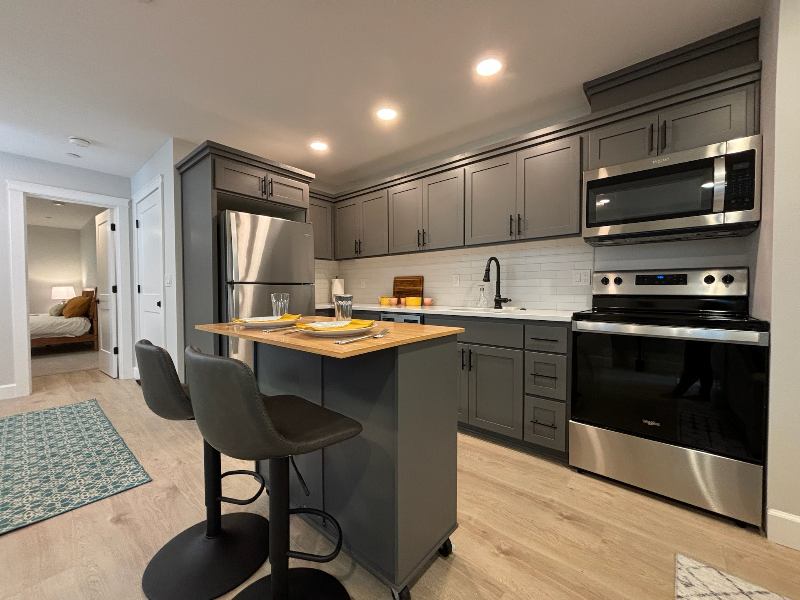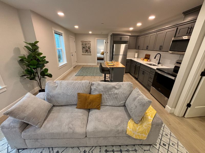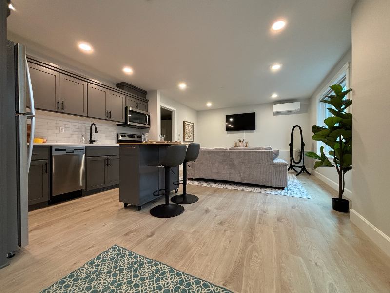 Welcome to this beautiful, star reviewed, bedroom unit, offering sq. ft. of modern living space with dedicated, offstreet parking. Step inside to find an inviting open layout, elegant wood floors, and highend finishes throughout. The living area is bathed in natural light from large windows and the kitchen includes sleek quartz countertops and modern appliances.