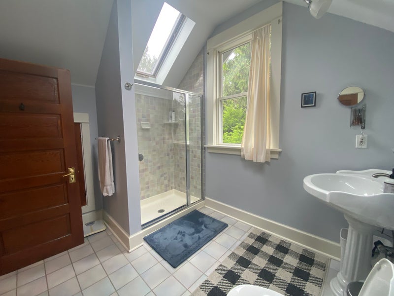 * Main bath (near bedroom/kitchen): tub + shower, updated sink, dual flush