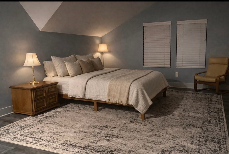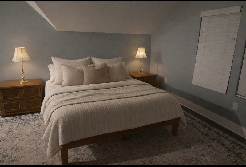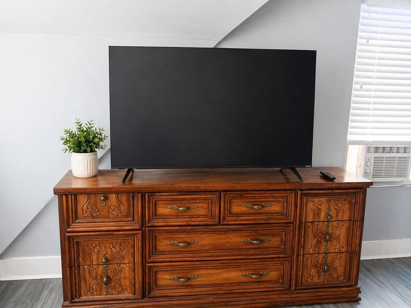 This spacious third-floor retreat offers both comfort and privacy, making it ideal for room sharing or a quiet personal escape. The room is thoughtfully furnished with a queen-sized bed, two 6-foot dressers for ample storage, and matching end tables to create a balanced, functional space. A dedicated desk area provides the perfect setup for remote work or study, while a 55-inch TV adds a touch of relaxation and convenience.