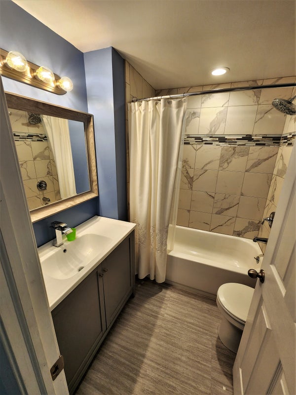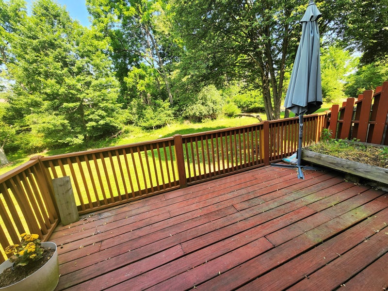 The main level features a bright and spacious living room filled with natural sunlight, an open-concept dining area and kitchen, and a conveniently located half bathroom. The kitchen boasts quartz countertops, modern appliances, and a stunning herringbone tile backsplash. Glass double doors open to the deck, perfect for enjoying the outdoors or a quiet morning coffee.