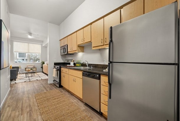 The apartment features a bright living area, a fully equipped kitchen, and a relaxed atmosphere that’s easy to feel at home in. The room is a good size and comes with the added benefit of a private bath.