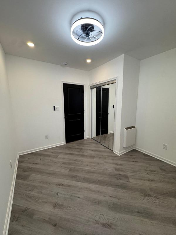 The bedroom features a large closet with double fulllength mirrored doors, creating a bright, open feel and providing excellent storage. The modern bathroom includes a walkin shower with beautiful tile work and stylish black fixtures.