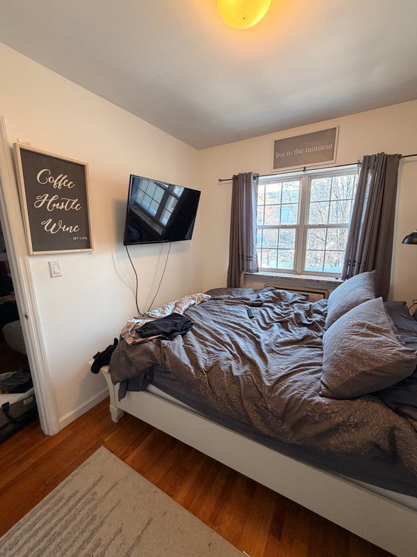 Room has a nice closet and can fit a queen size bed. Shared living space has lots of room as well a juliet balcony. Kitchen has a dishwasher. Living room/Kitchen area is fully stocked/furnished. Current tenant is offering bed frame with the room for $150. A/C unit in the room works and is included with the room.