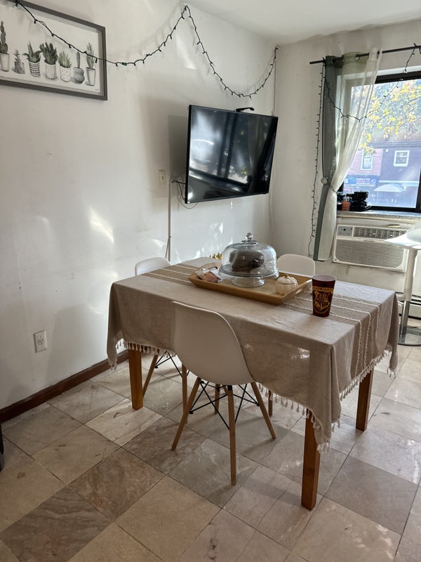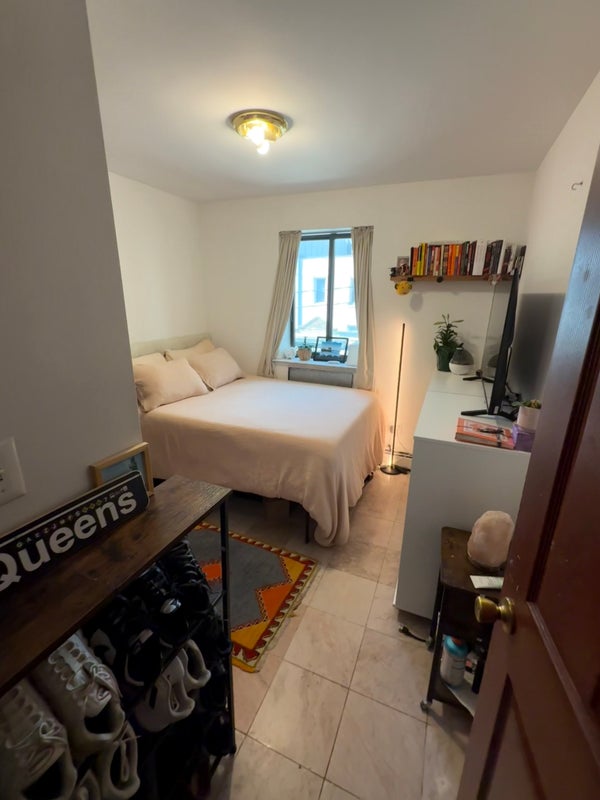 No pets, couples, or smoking. The bedroom will be unfurnished. The apartment is right near an above-ground subway line, but the room does not face the tracks.