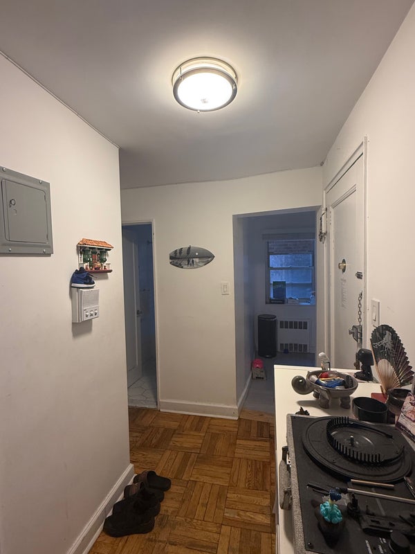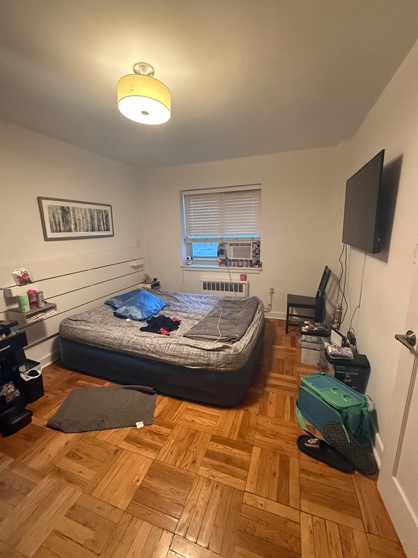 This bedroom is super cozy. It can fit a queen bed and even a desk next to it. It also has two closets inside. The area has decent parking and is quiet, you can hear the birds chirp. Also a 10 min walk to the E & F train