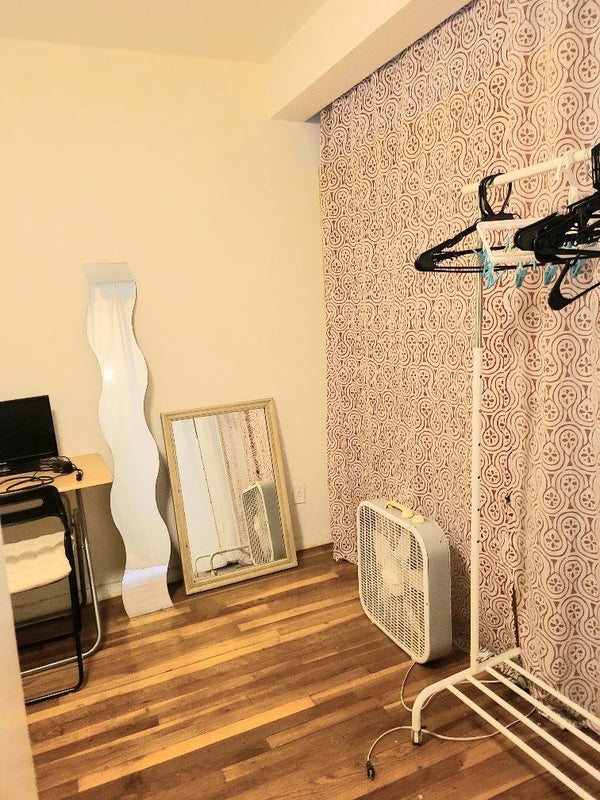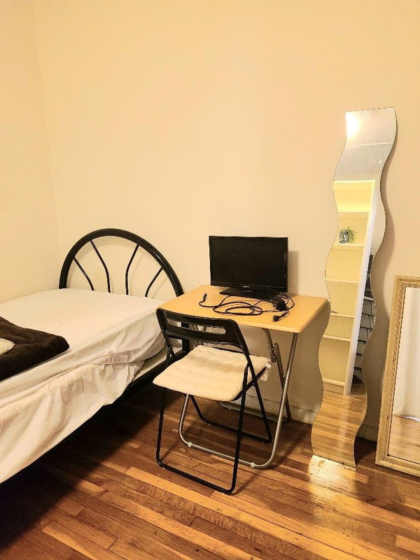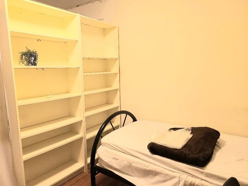 The Room: - Furnished with A Twin size bed, A Small Desk and a Chair, A Small table, 2 Large shelves, A Mirror, A Cloths rack - A large shared walk-in closet. - with hardwood floors and enough storage.