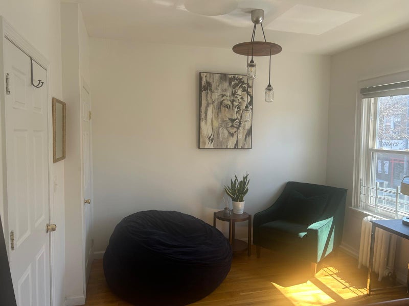 Spacious and fully furnished room available in Forest Hills on Metropolitan Ave. The room includes a comfortable queen-size bed, two small bedside tables, a dresser, and a closet for storage. There is also a dedicated workspace, perfect for working from home, plus a high-end armchair with a side table for relaxing.