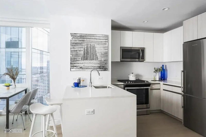 This elegant one-bedroom residence offers south facing views. It features an in-unit washer/dryer, white desert oak flooring, floor-to-ceiling windows, solar shades, LED lighting and more. The kitchen includes a gas range, dishwasher, custom cabinetry, under cabinet lighting and Caesarstone counters, while the bathroom offers a tri-view mirror with storage and custom European vanity.