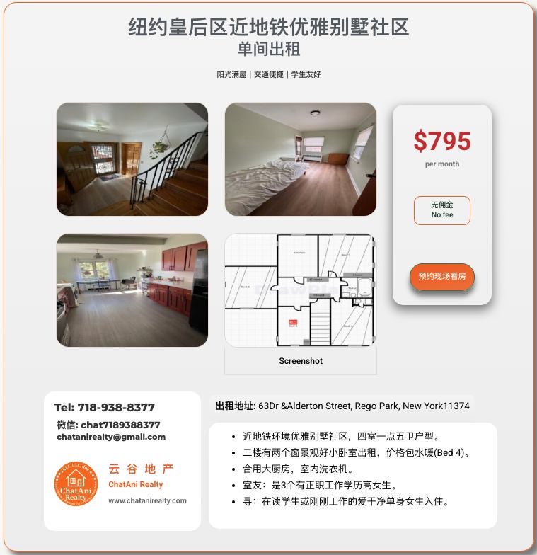 Located near the subway, this elegant villa community features a four-bedroom, one-and-a-half-bathroom layout. A small bedroom with two windows and a good view on the second floor is available for rent. The price includes water and heating (Bed 4). Shared large kitchen, in-unit washing machine. My roommates are three highly educated women with full-time jobs. Looking for a clean and tidy single female student or recent graduate to stay in.