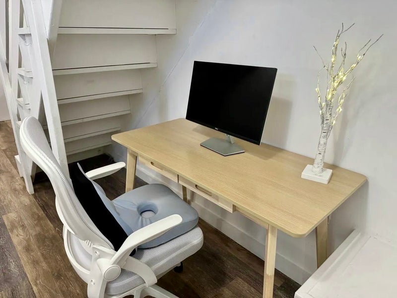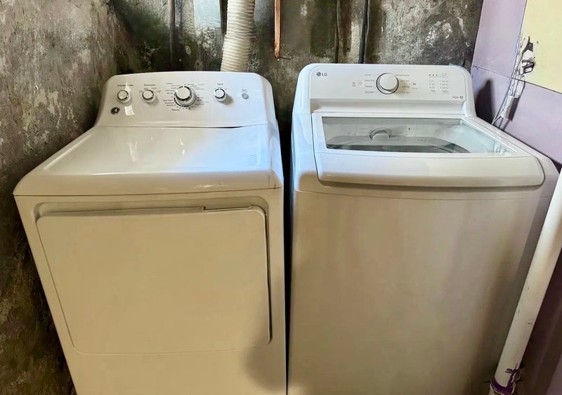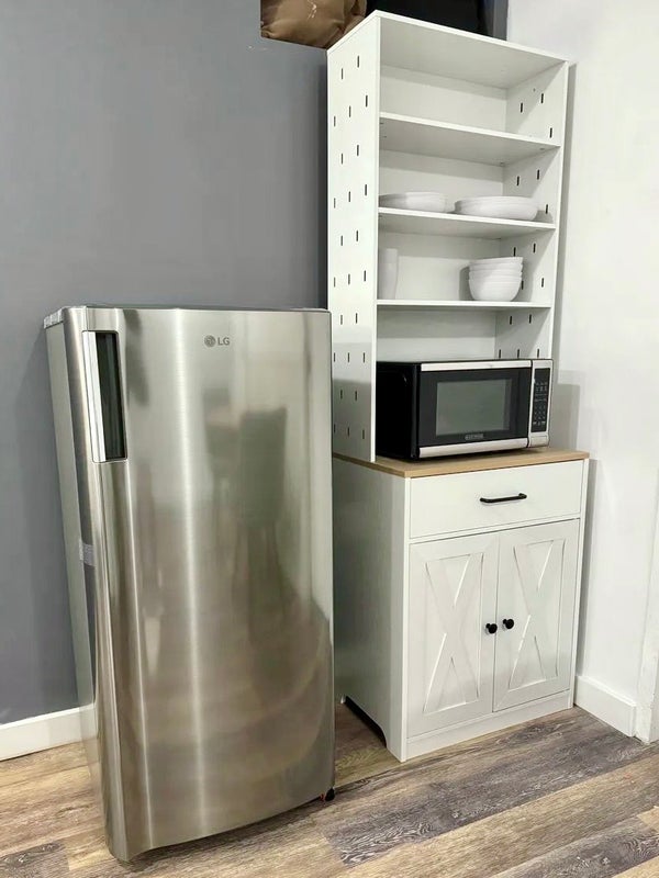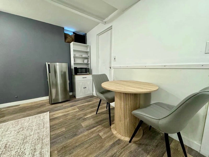 Large studio approx. 18'6 x 12'9 New Casper Queen hybrid mattress ($800+ value) Work station: desk, ergonomic office chair, Dell monitor Round dining table with two chairs LG full-size refrigerator with freezer Brand new microwave Full bathroom with subway tile and bathtub Washer and dryer access Walk-in closet with shelving Full-length mirror storage cabinet AC unit (heating and cooling) Dishware, cups, and bowls included Private entrance through garage