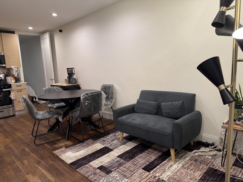 Nice room with central air near the M train. We are a household of four who appreciate cleanliness and organization. The apartment is a duplex, providing a comfortable and inviting living space. All of us are employed and independent. The photo shows one of the roommates because the available room is unfurnished and includes a private bathroom. It is required to have four times the rent and a 650 credit score.
