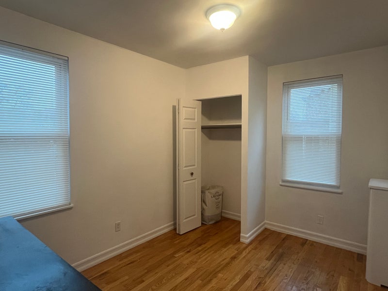 The room fits a queen bed easily, has a built-in closet, two sunny windows, and comes with a wooden dresser.