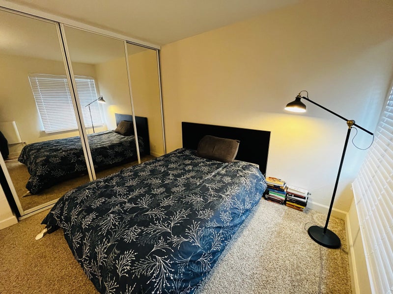 The Room Your own bedroom with a private bathroom - no sharing. The room has a west-facing window that brings in warm afternoon sun and a view of the Santa Cruz Mountains. Large mirrored closet with sliding doors. Can come furnished (queen bed, desk, etc.) or unfurnished - your choice. See the floor plan photo - the available room and bathroom are highlighted in red. The Apartment The shared spaces are well-kept and comfortable. The kitchen features stainless steel appliances, plenty of cabinet space, and dark countertops. The living room is spacious with a big sliding glass door that floods the space with natural light, opening to a balcony with views of the lagoon and surrounding neighborhood. There's also a separate dining area with ceiling fan. In-unit washer and dryer for convenience. Building & Community Amenities