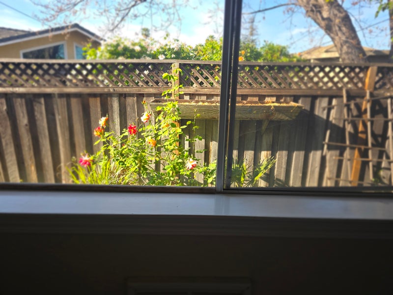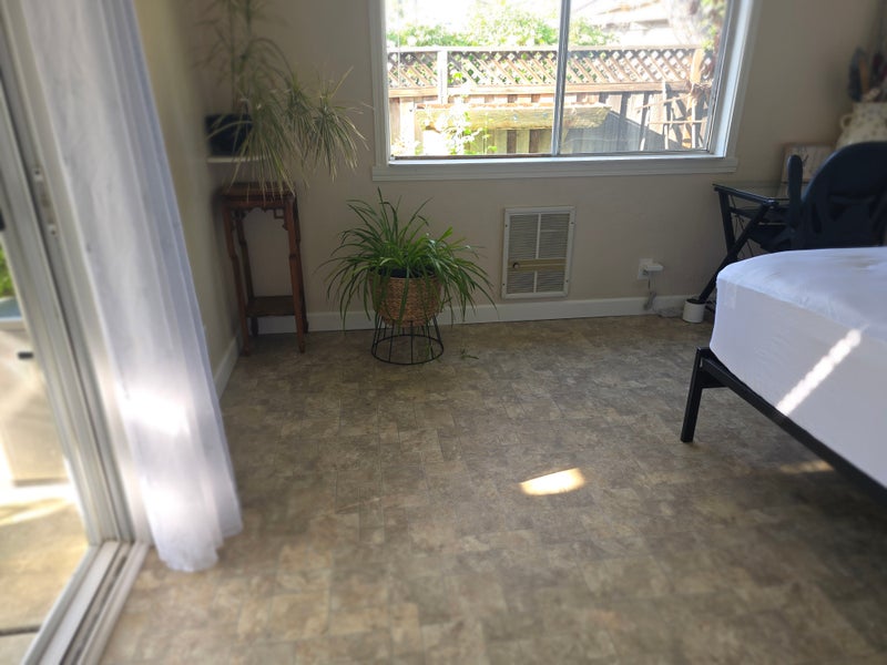 Bright, fully furnished "garden room" with direct access to a private sunny patio in a warm, safe, well-kept Campbell home. Two windows with garden views, rose bushes right outside, lush indoor plants — it feels more like a retreat than a rental.