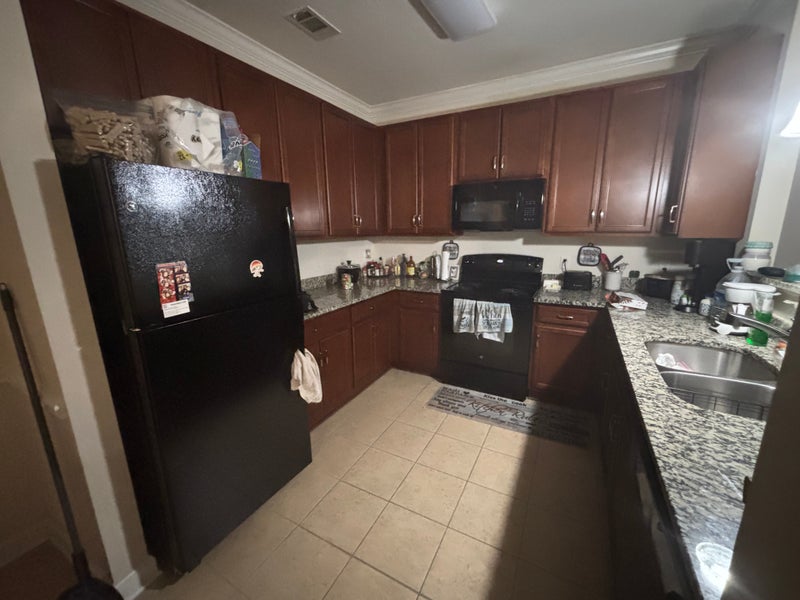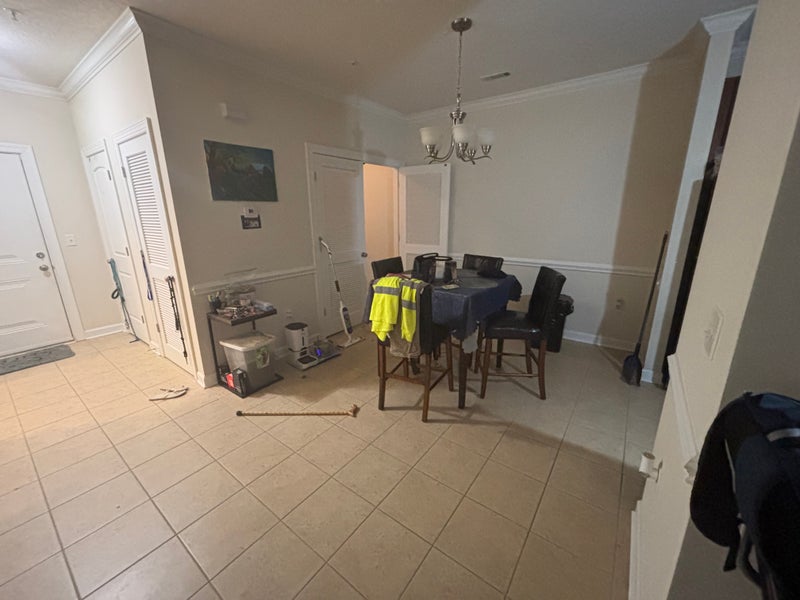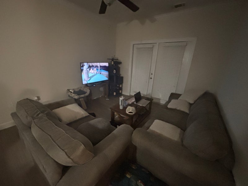 It is 2 bedroom 2-bathroom apartment. Located on the second floor that comes with a nice deck. Nice kitchen with granite counters and dishwasher. There is a washer and dryer in apartment, internet and electric all included. Property has a gym and pool area. I personally have a dog and 2 cat that stay out of spare bedroom/bathroom. Two times a month I have a cleaner that cleans the shared areas. The room includes a walk in closet and private bathroom connected to the bedroom. Shared areas are kitchen, dining room, patio, laundry room and living room. There is an Aldi’s across from the apartment complex