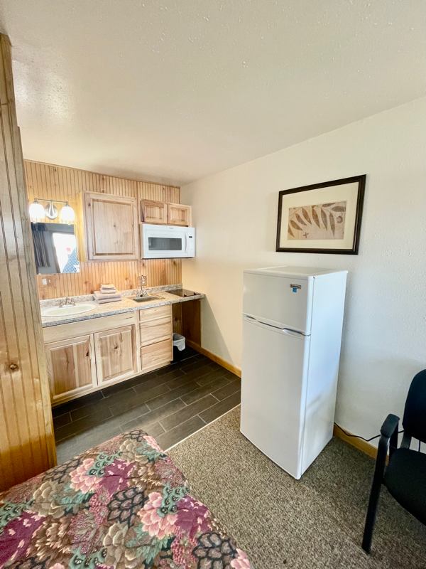 Each studio includes a queen bed, ” Smart TV, couch, dresser, microwave, stovetop & fullsize fridge.