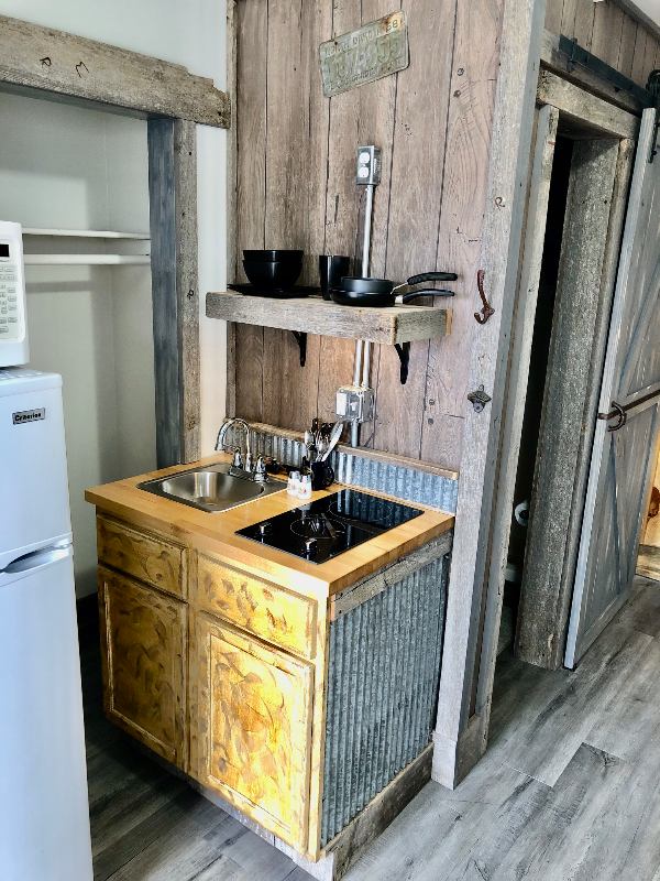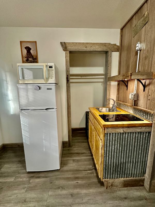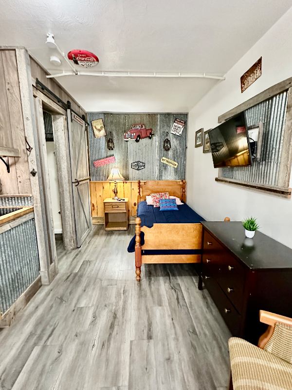 Each studio features a bed, ” Smart TV, couch, dresser, microwave, stovetop & fullsize fridge.