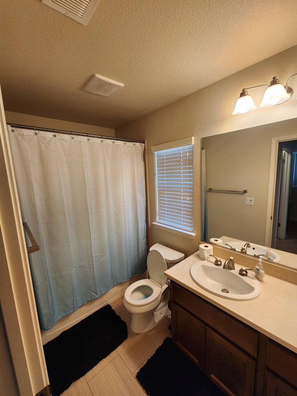 3 bedroom house. 3rd bedroom is an office that we can both use. Full use of the public spaces. Half bathroom is downstairs. Current tenant works full time but very laid back.