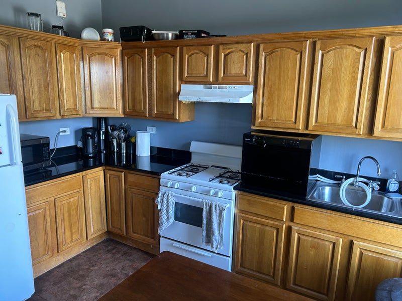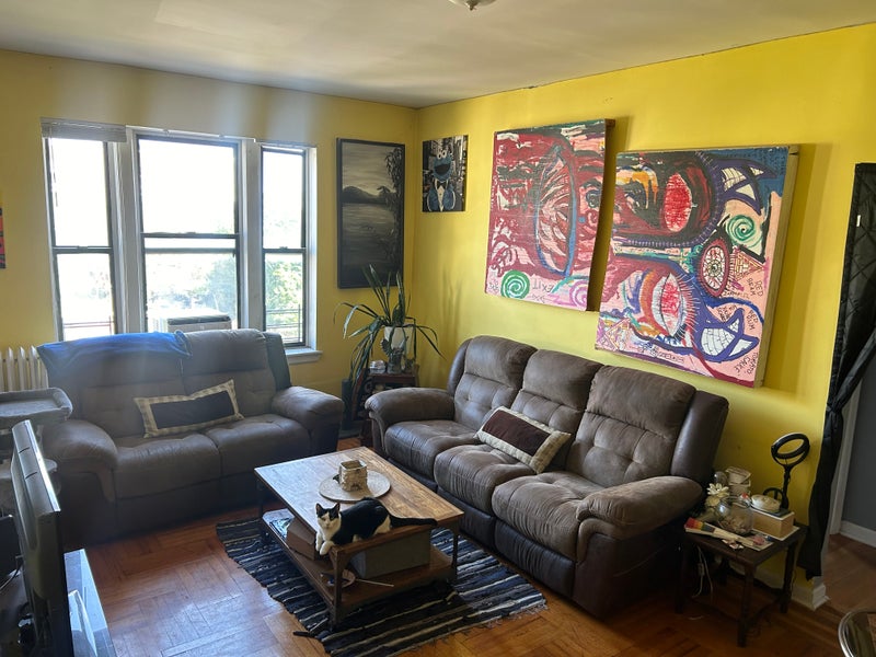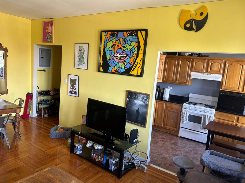 The Apartment Beautiful hardwood floors throughout Bright yellow accent wall in living room Large living room with two comfortable couches Modern art and creative vibe Separate dining area Full kitchen with stove & cabinet space Clean bathroom Natural light from multiple windows