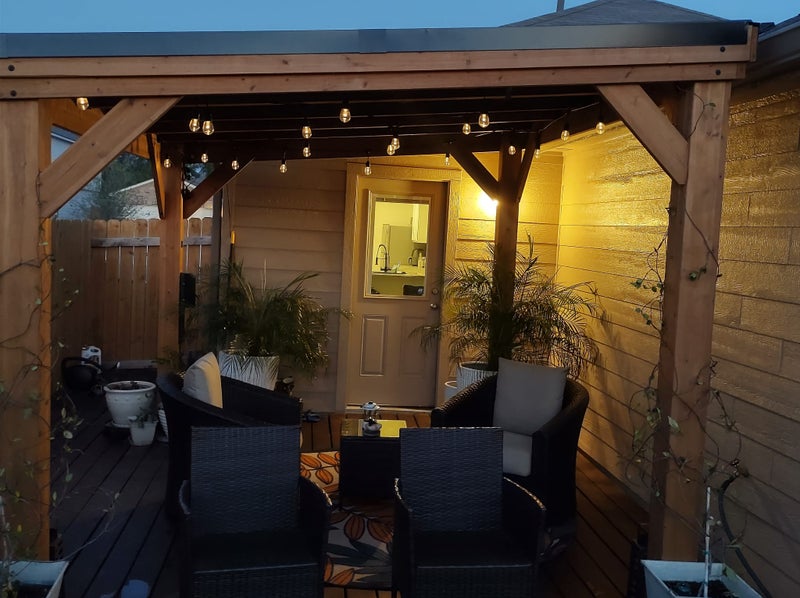 Backyard: * Pergola * Outdoor dining * Fire pit * Gas + charcoal grill